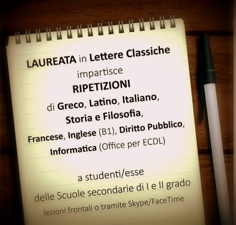 Simpatia e semplicità sono da sempre. I Laureati nel Corso di Laurea Magistrale Interclasse in Lettere Classiche e Moderne acquisiscono una adeguata preparazione nei settori delle lingue delle letterature e delle culture classica e moderna dal mondo greco-romano a quello contemporaneo senza rinunciare al confronto con le altre tradizioni letterarie. Ho anche insegnato in scuole private materie classiche. Ho esperienza ventennale in aiuto compiti e ripetizioni per tutti i livelli scolastici con ottimi risultati.